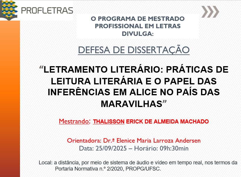 O PROFLETRAS-UFSC está aceitando pedidos de admissão de Aluno Especial, por meio de matrícula em disciplina isolada, para o semestre 2025-2, nos termos das Resoluções 001-2019 e 004-2021, da Coordenação Nacional do Programa.