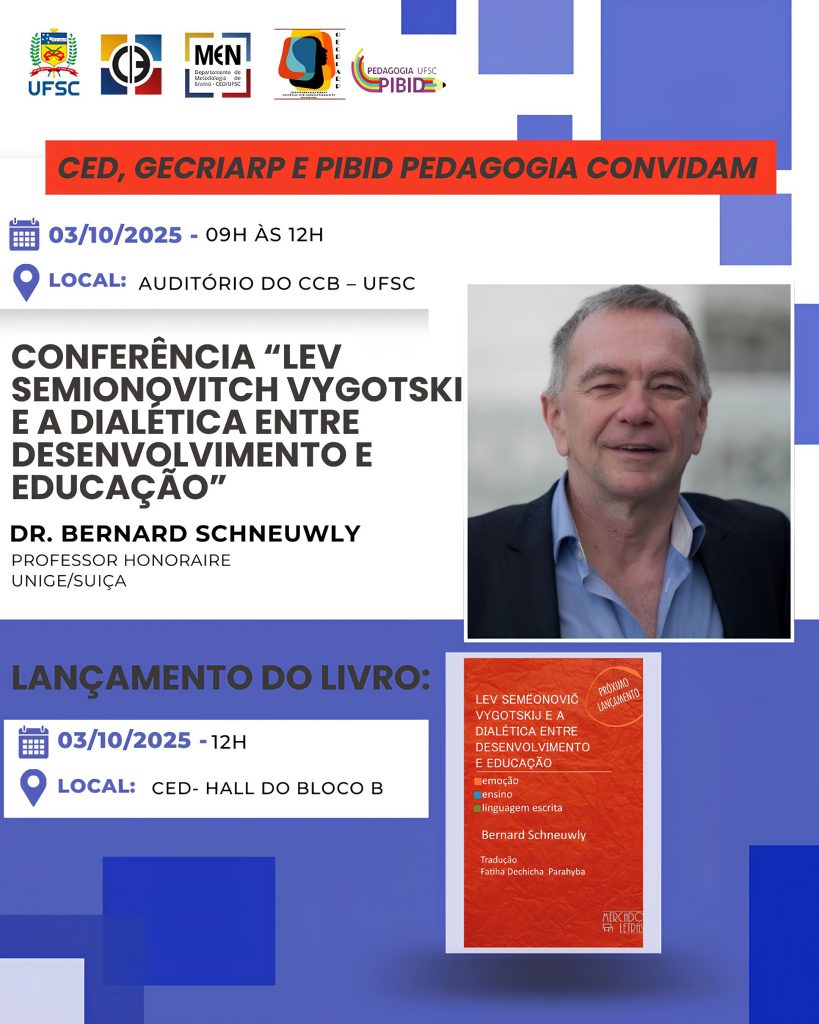 Lançamento de Livro: Na sequência da conferência, o Prof. Dr. Bernard Schneuwly lançará o livro “Lev Semeonovitsch Vygotskij e a Dialética entre Desenvolvimento e Educação“, uma obra fundamental para a área.